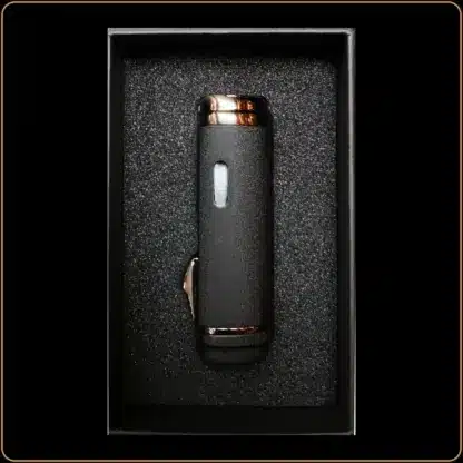 Upaljač je izrađen od kvalitetnog metala, sa teksturiranom površinom koja leži čvrsto u ruci, bez klizanja. Mehanizam je pouzdan, a plamen stabilan i snažan – savršen za paljenje tompusa čak i na vetru. Vizuelno diskretan, ali autoritativan u nastupu.