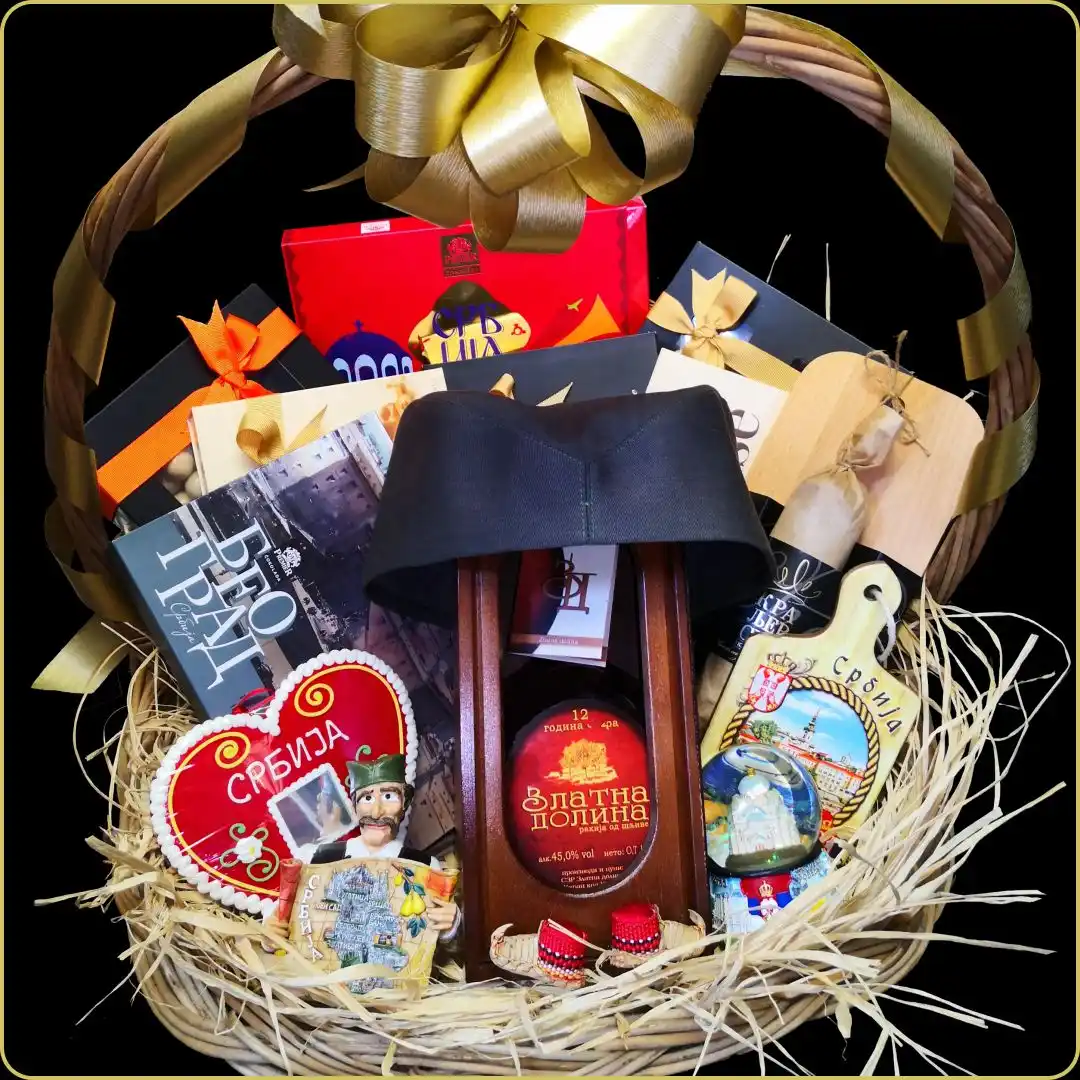 Svaki detalj u ovoj korpi pažljivo je biran da bi pričao priču o Srbiji: od ručno izrađenih suvenira i simbola, preko vrhunske rakije Zlatna Dolina, do čokolada sa motivima Beograda i nacionalnih obeležja. Sve je uklopljeno sa posebnom pažnjom na estetiku i poruku koju poklon nosi.