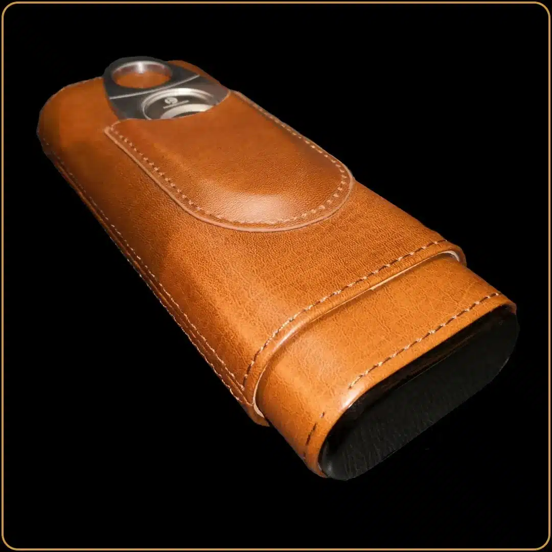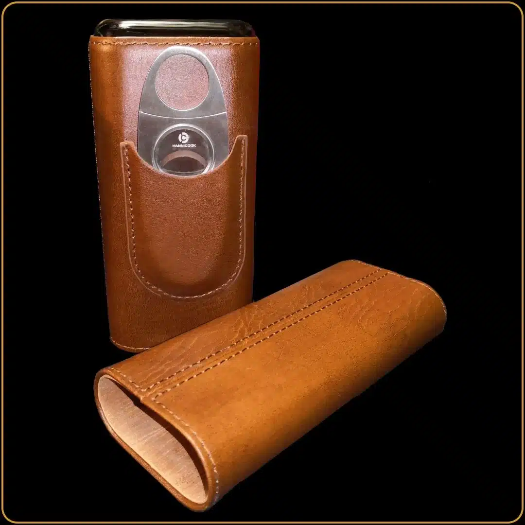 - 📦 Kožna futrola sa prostorom za 3 cigare, unutrašnjost obložena kedrovinom – materijal koji čuva vlažnost i aromu cigara
