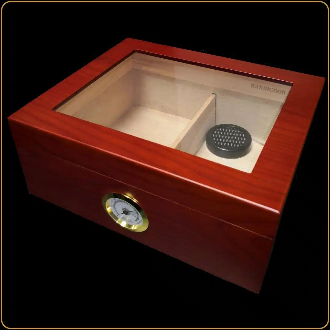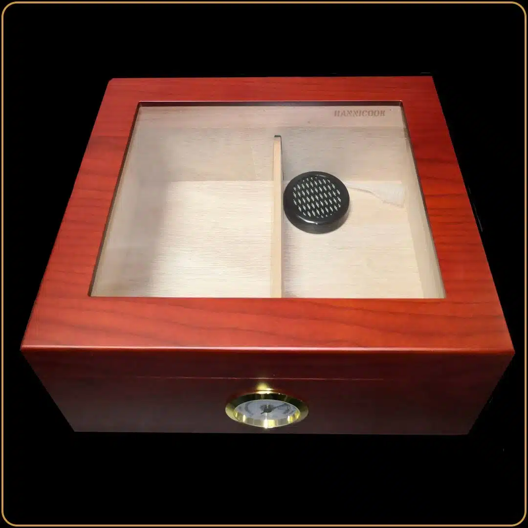 Hjumidor Cherry veći je dizajniran tako da čuva aromu i svežinu cigara uz optimalnu vlažnost. Napravljen je od kvalitetnog drveta, sa unutrašnjom pregradom i elegantnim staklenim poklopcem koji omogućava pregled sadržaja bez otvaranja kutije. Ugrađeni higrometar i ovlaživač vazduha brinu o idealnim uslovima, dok topla cherry nijansa daje posebnu notu ovom poklonu.