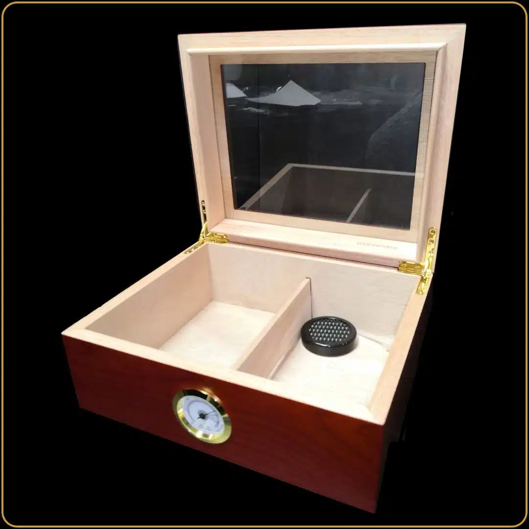- 🪵 Drveni hjumidor u cherry nijansi (kapacitet 30–35 cigara)