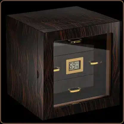 Hjumidor Hannicook Braon izrađen je od drveta visokog kvaliteta, sa završnom obradom visokog sjaja koja podseća na ebanovinu sa bogatim prirodnim šarama. Njegova vrata su od prozirnog stakla, što omogućava elegantan pogled u unutrašnjost – kao da je galerija posvećena cigarama. Tri fioke omogućavaju sistematično odlaganje, dok digitalni higrometar sa preciznim prikazom vlažnosti obezbeđuje idealne uslove čuvanja – između 65% i 72% relativne vlažnosti, što je optimalno za premium cigare.