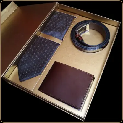 Set sadrži kvalitetnu kravatu, kožni braon novčanik, kožni kaiš, upakovane u kutiju boje starog zlata.