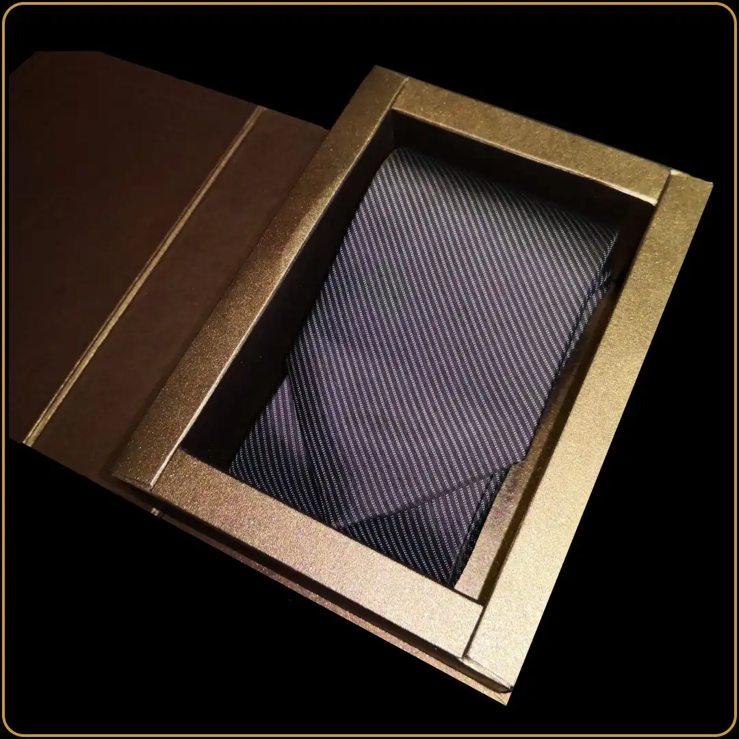 Kravata je upakovana u tvrdu, zlatnu kutiju sa poklopcem – odmah spremna za darivanje, bez dodatnog pakovanja.