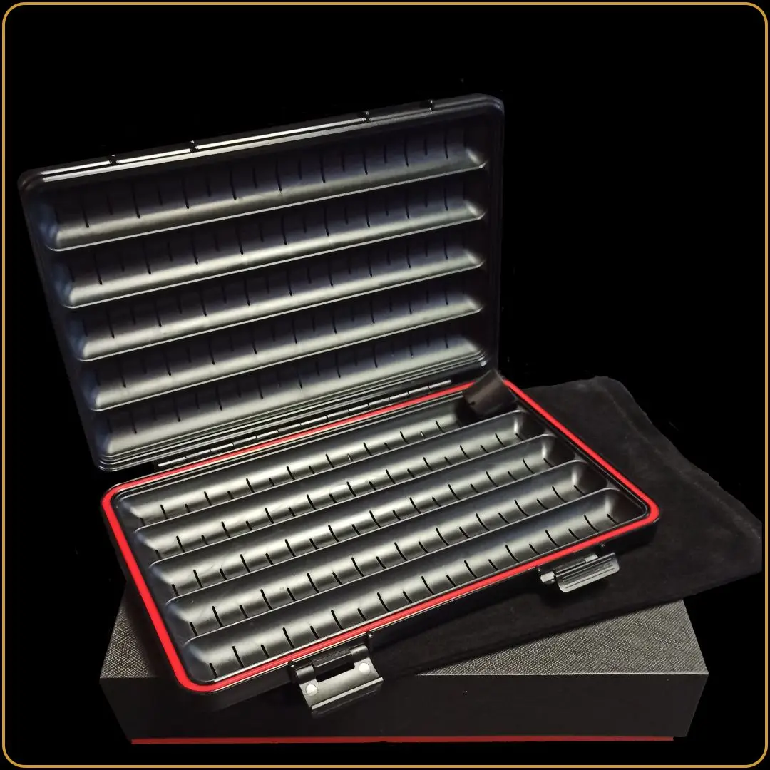 Model je dimenzionisan za transport do pet cigara, sa jasno definisanim mestima za odlaganje. Ovakva organizacija čini ga pogodnim za putovanja, poslovne sastanke i diskretno nošenje.