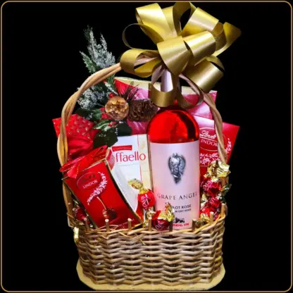 Da — nežno vino, čokolade i praznična estetika čine ovu korpu izuzetno pogodnom kao romantičan i topao poklon za partnerku.