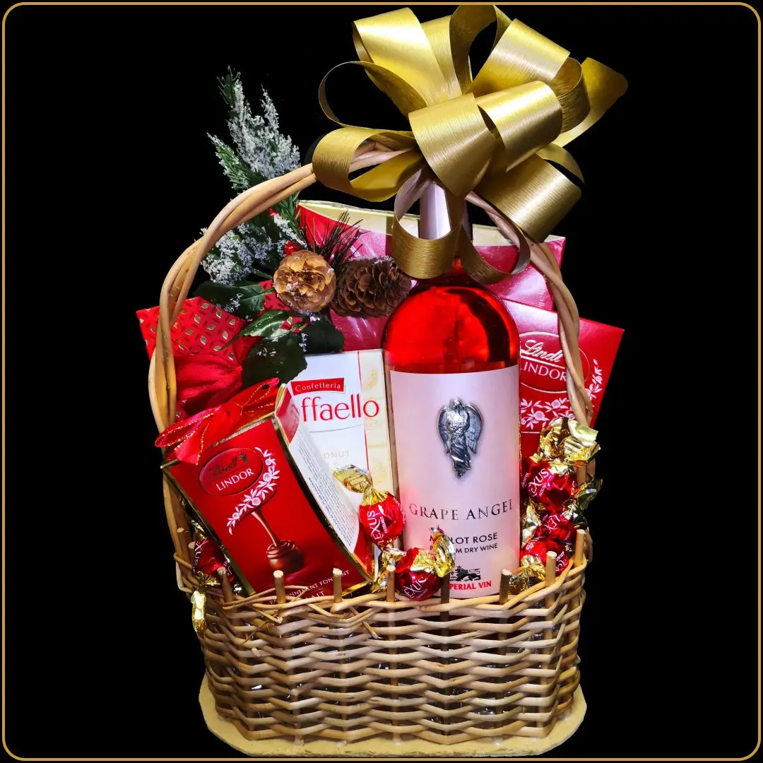 U centru ove praznične korpe nalazi se lagano i aromatično Grape Angel Merlot Rose, savršen izbor za žene koje cene nežne ukuse i vizuelni dojam. Idealan je kao poklon ljubavi za žene, ali i kao poklon za koleginicu kojoj želite da se zahvalite ili obradujete uz stil i emociju.