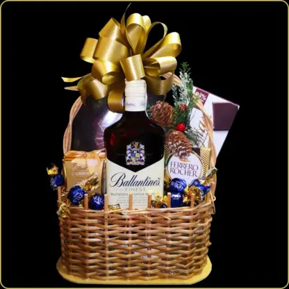 Centralno mesto zauzima Ballantine’s Finest – jedan od najpoznatijih škotskih viskija sa bogatom aromom i izbalansiranim ukusom. Njegove note vanile, hrastovine i meda čine ga savršenim izborom za poklon u svečanim prilikama. Uz to, u korpi se nalaze birani slatkiši: