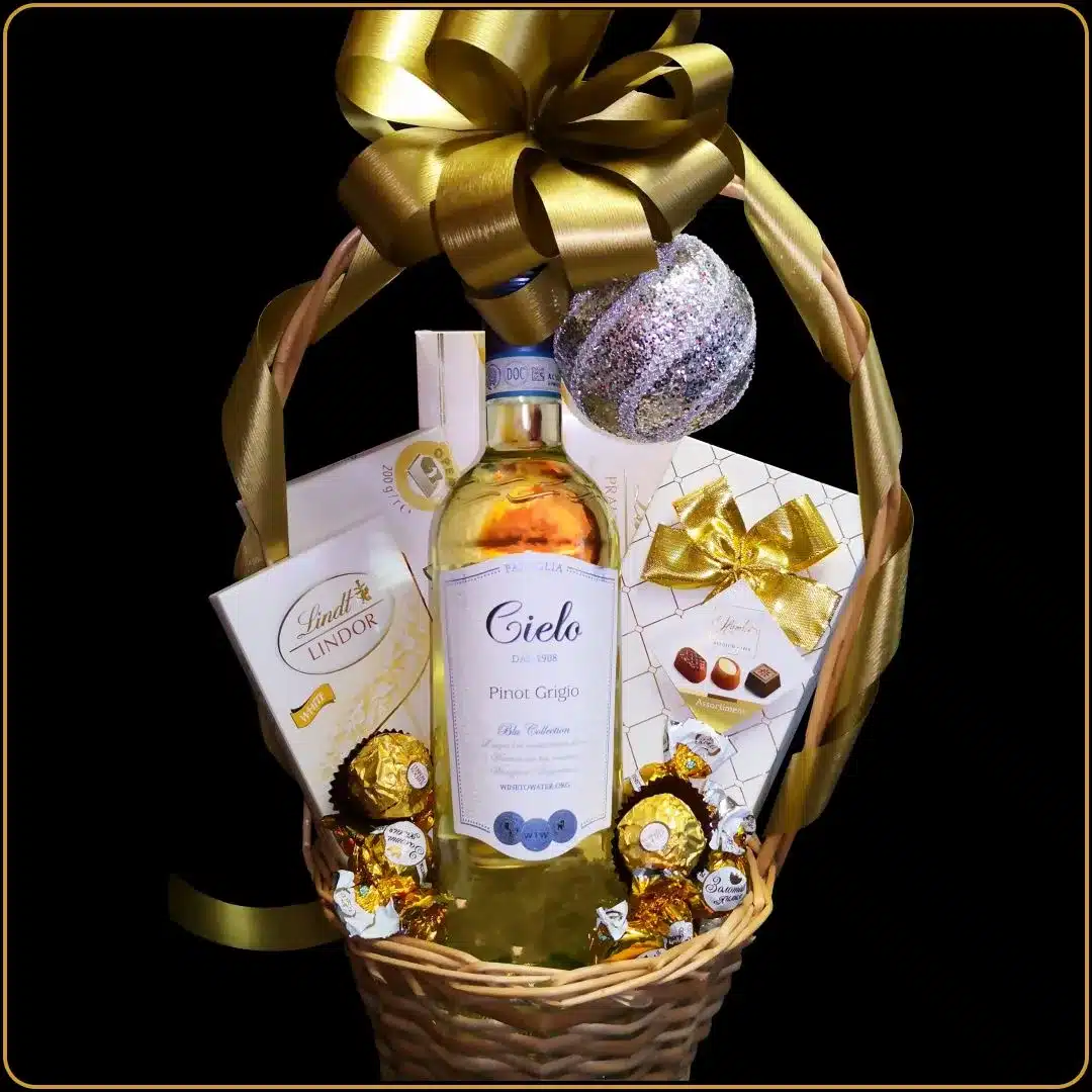 Novogodišnji poklon Cielo Grigio je praznična poklon korpa za kolege i prijatelje, idealna za kraj godine i poslovno darivanje. Uz pažljivo odabrano belo vino i kombinaciju zlatnih čokolada, ovaj novogodišnji poklon odiše elegancijom, ukusom i stilom. 🎄