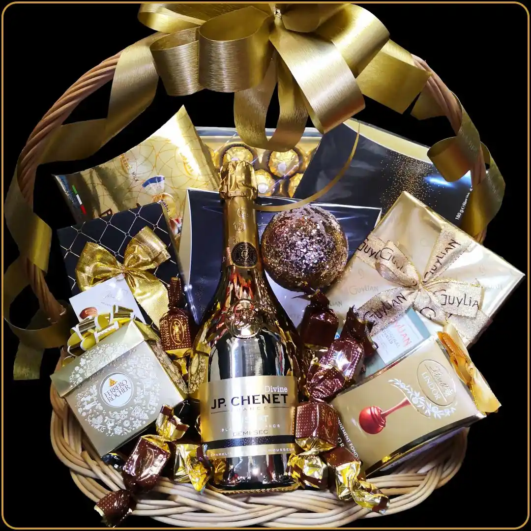 U središtu ove raskošne poklon korpe nalazi se JP Chenet Divine Muscat – penušavo vino iz Francuske, poznato po laganoj, voćnoj noti i zlatnom dizajnu boce. Ovaj Muscat niskog sadržaja alkohola je savršen za praznične trenutke – osvežavajuć, lagan, a opet dovoljno karakteran da ostavi utisak. Sa njim slavlje počinje.