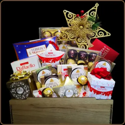 Novogodišnji poklon Ferrero je pažljivo aranžirana poklon gajbica preplavljena najfinijim čokoladnim zadovoljstvima iz Ferrero i Raffaello kolekcije. Idealan je kao poklon za ženu, poklon za muškarca, ali i kao upečatljiv poslovni poklon za praznike. U praznično dekorisanoj drvenoj kutiji nalazi se pravo blago ukusa i elegancije koje će oduševiti svakog primaoca.