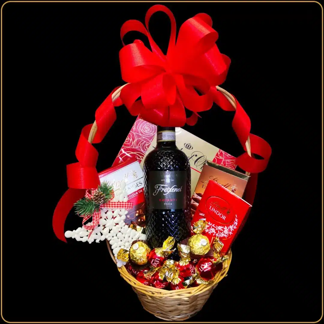 Freixenet Chianti 0.75l je suvo crveno vino iz Italije, poznato po rubin-crvenoj boji, voćnim aromama trešnje i suve šljive, sa blagim taninima i nežnom završnicom. Savršen je izbor uz čokoladu – i upravo zato ova poklon korpa ima sledeći raskošan sastav:
