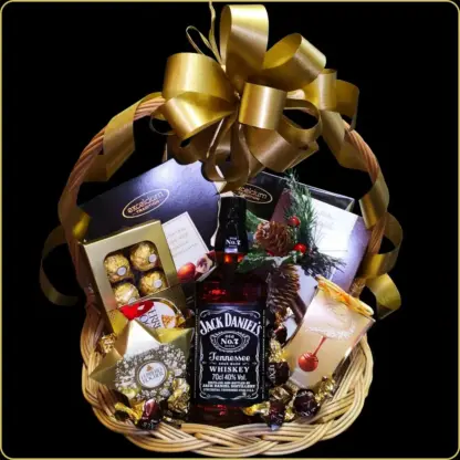Jack Daniels viski 0,7 l, više brendiranih čokolada (Ferrero, Excelcium, Lindt, Cupido), novogodišnji ukras, pletena korpa, celofan i praznična mašna.
