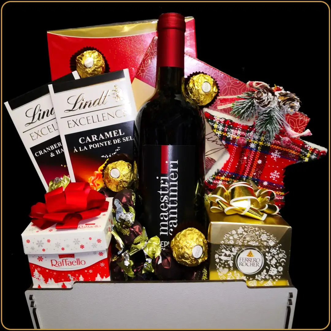 Sa izabranim crvenim vinom, Ferrero i Lindt čokoladama, uz praznični dekor, Maestro nije samo poklon – već iskren praznični gest koji se pamti. 🎄
