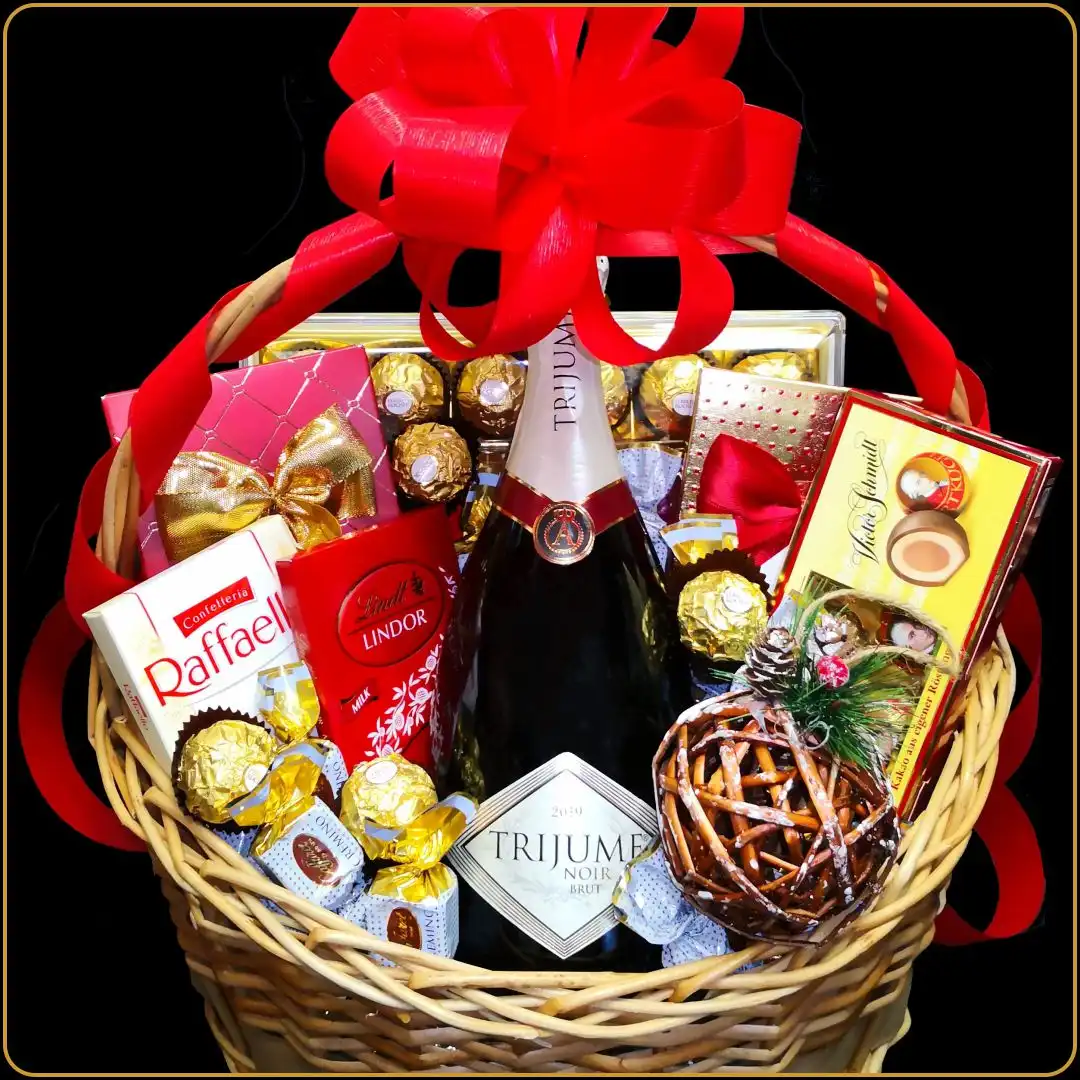 Novogodišnji poklon Trijumf je praznična poklon korpa koja donosi eleganciju, prestiž i slatku radost u svakom detalju. U srcu ove bogate korpe nalazi se vrhunsko penušavo vino Trijumf Noir, savršen izbor za poklon za Novu godinu, ali i kao pažljiv poklon za suprugu ili devojku.