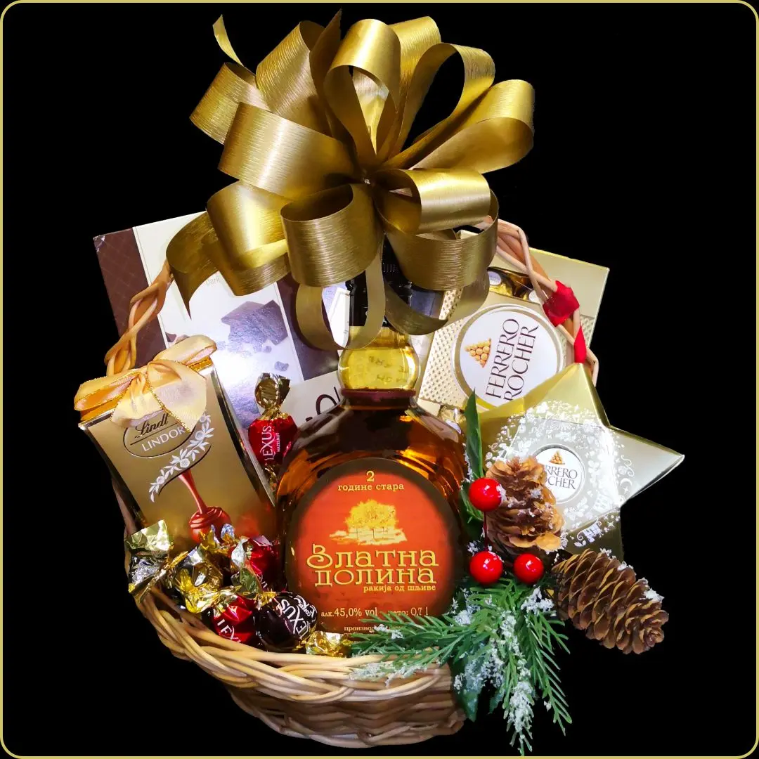 Glavno mesto zauzima Zlatna Dolina rakija – prirodna šljivovica odležala dve godine, proizvedena u Srbiji. Njena ravnoteža između snage i pitkosti čini je savršenom za poklon. U nastavku se nalaze pažljivo birane čokolade koje dopunjuju praznični doživljaj: