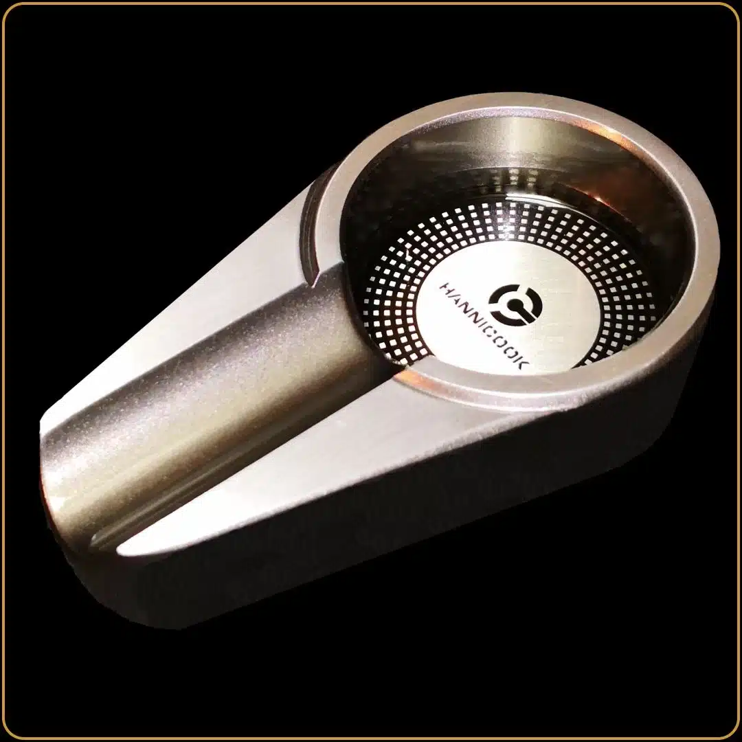 Ova pepeljara, izrađena od metala u srebrnoj boji, sa elegantnim sjajem i modernim dizajnom, pruža praktičnost i stil. Pogodna je za jednu cigaru i savršeno se uklapa u ambijent radne sobe, bara, terase ili kancelarije. Lako se kombinuje sa priborom za cigare i poklonima sa pićem, što je čini savršenom za kombinovani poklon set.