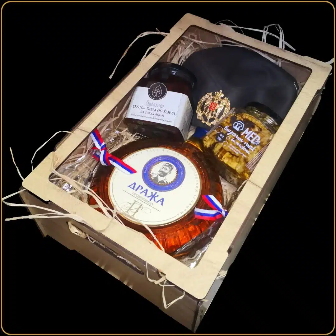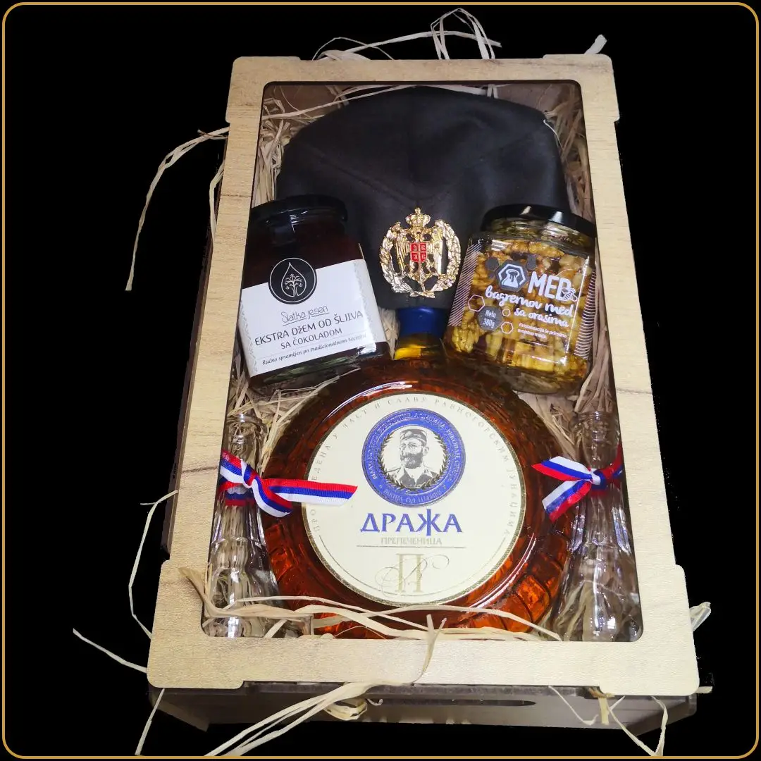 Poklon Čiča Draža Šljiva je snažan simbol tradicije, istorije i ponosa. U ukrasnoj drvenoj gajbici sa poklopcem nalazi se čuvena rakija Draža šljiva, originalna šajkača sa kokardom, bagremov med sa orasima i džem od šljiva sa čokoladom – sve ono što čini srce jednog istinskog etno poklona iz Srbije. Namenjen je kao autentičan poslovni poklon, ali i pažnja za prijatelje iz dijaspore ili ljubitelje nacionalne tradicije.