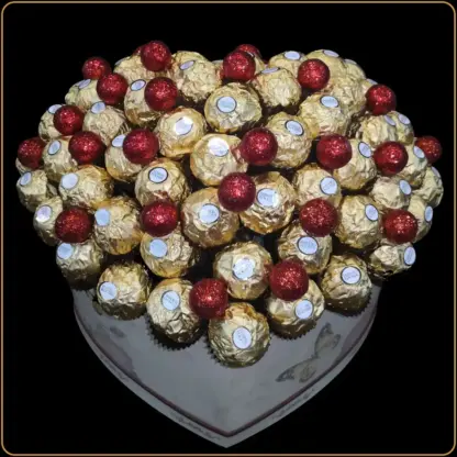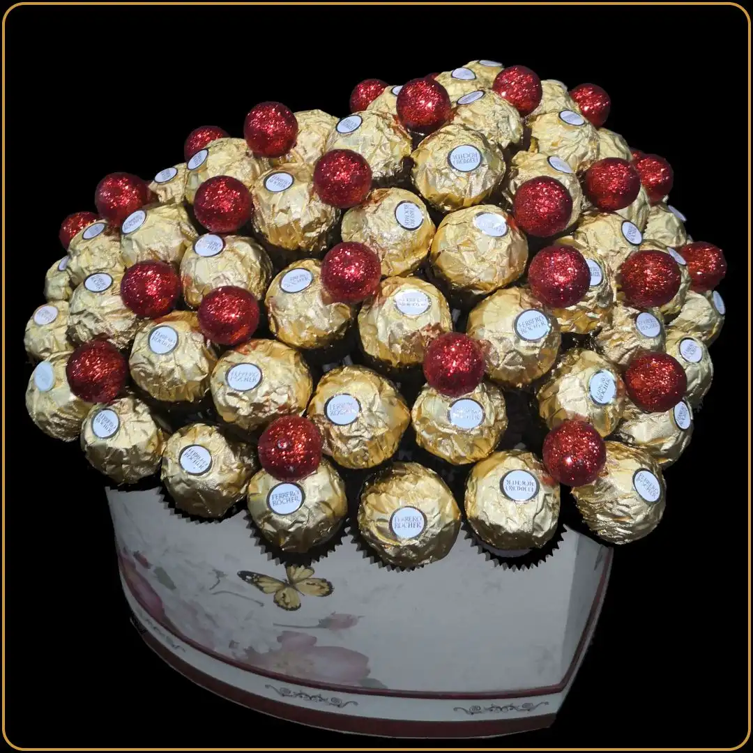 U središtu ovog poklona nalazi se luksuzan slatki aranžman od najpoznatijih čokoladnih kuglica na svetu – Ferrero Rocher. Svaka kugla obložena je zlatnim papirom, a među njima su pažljivo raspoređene crvene dekorativne kuglice koje unose romantičan kontrast i praznični šarm.