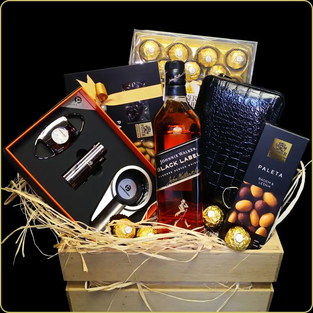 Kada želite da poklonom prenesete poruku stila, poštovanja i pravog muškog ukusa – Poklon gajbica Johnnie Black je izbor koji govori umesto vas. U elegantnoj drvenoj gajbici smestili smo čuveni Johnnie Walker Black Label, kvalitetan putni hjumidor i set za cigare, okružen ekskluzivnim slatkišima.