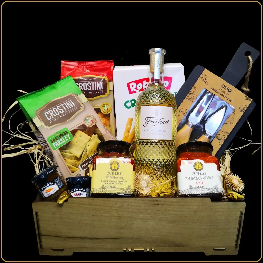 Ručno aranžirana, upakovana sa rafijom i mašnom, donosi ukuse juga – spoj vina, ajvara, začina, krekerčića i dodataka za serviranje. Prava mala poklon gajbica koja budi čula i stvara uspomene.