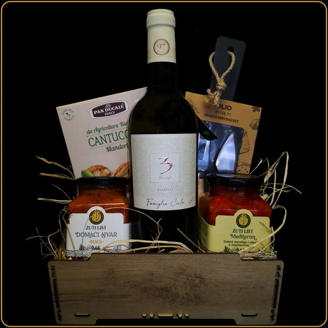 Ručno aranžirana, upakovana sa rafijom i mašnom, donosi ukuse juga – spoj vina, ajvara, začina i dodataka za serviranje. Prava mala poklon gajbica koja budi čula i stvara uspomene.