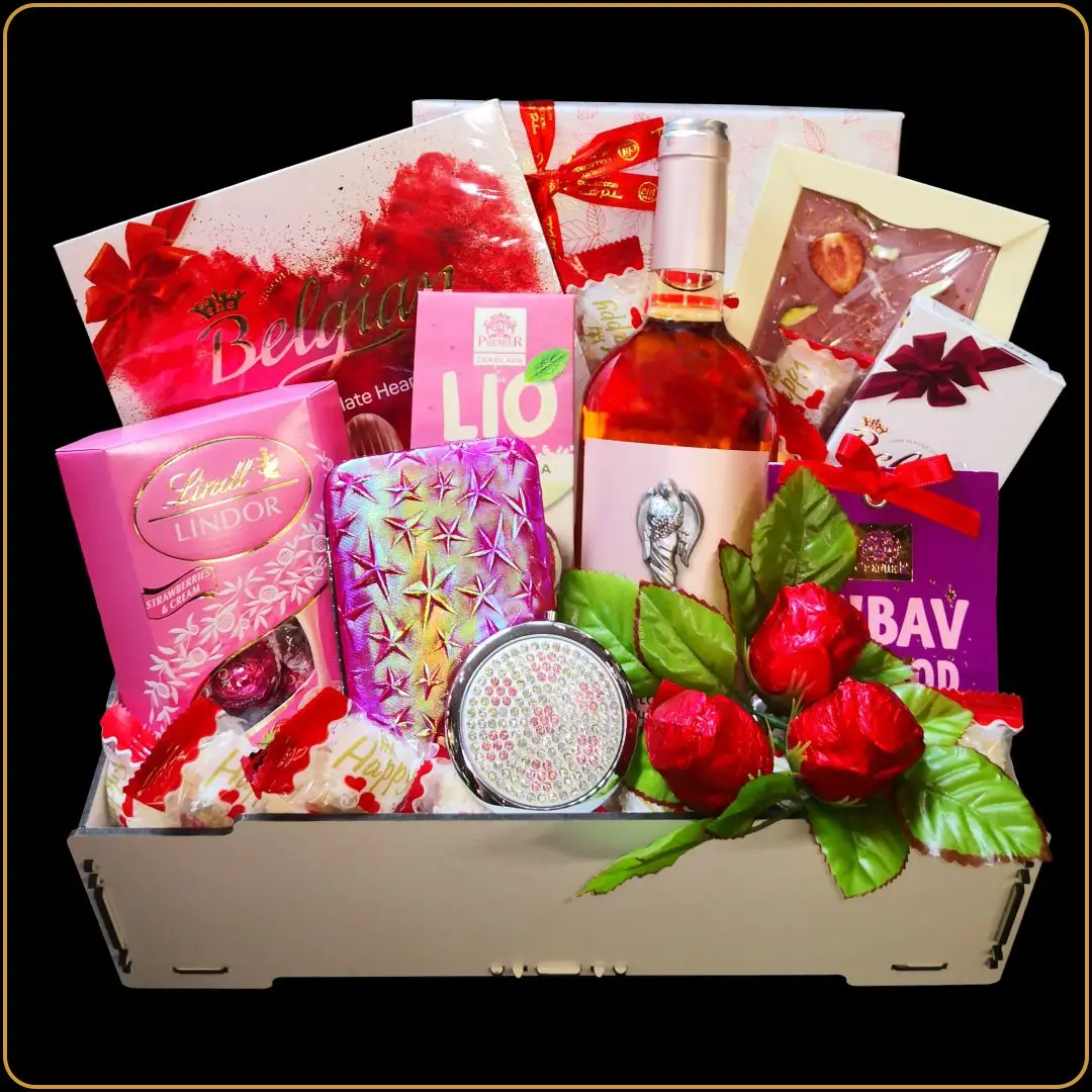 Poklon gajbica Radacini Rose je pažljivo aranžiran poklon za žene koje znaju da uživaju u lepim stvarima. U drvenoj gajbici nalaze se roze vino, ogledalce, manikir set i pregršt čokoladnih poslastica sa ukusom jagode. Idealan je poklon za devojku, poklon za rođendan ili poklon za Dan zaljubljenih. Za sličnu inspiraciju, pogledajte i druge poklon korpe za žene.