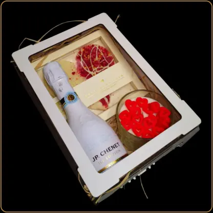 Poklon gajbica Sveća srce je pažljivo kreiran poklon za izražavanje ljubavi i nežnosti. U elegantnoj drvenoj gajbici nalazi se penušavo vino, ukrasna sveća i srcolika čokolada – spoj koji simbolizuje pažnju, romantiku i stil. Idealna je kao poklon za Dan zaljubljenih, ali i kao poklon za devojku ili suprugu za posebne prilike poput godišnjica ili intimnih iznenađenja. Ova gajbica dolazi u aranžmanu koji osvaja na prvi pogled – toplina i elegancija u jednom. Pogledajte još sličnih poklon korpi sa šampanjcem ili otkrijte kolekciju poklona ljubavi za žene.