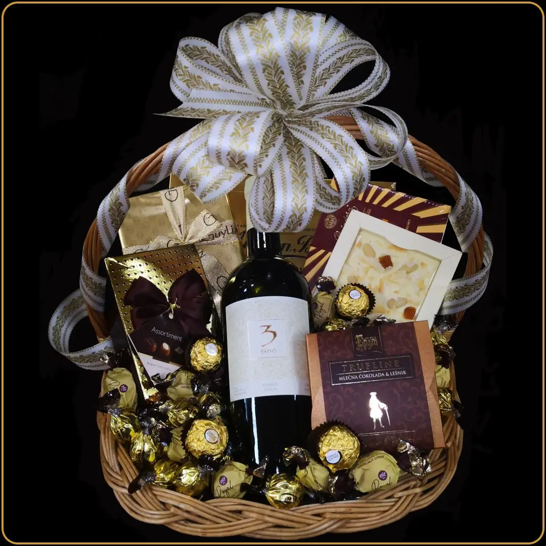 🎁 Poklon korpa 3 Passo Bianco – elegancija, vino i slatkiši