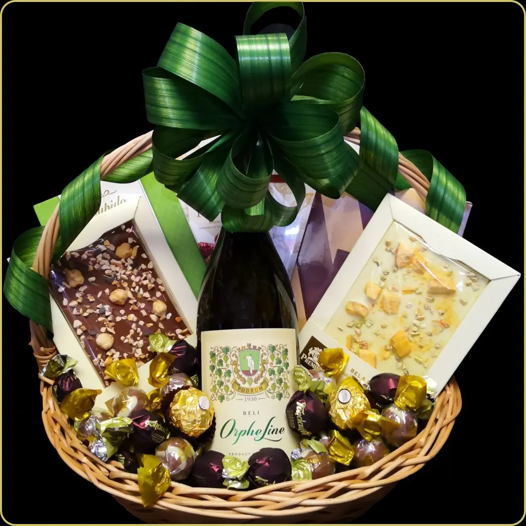 U centru ove korpe je Orfelin belo vino – elegantno, blago, sa voćnim notama, proizvedeno u Srbiji. Uz njega dolaze i ekskluzivne čokolade, praline i bombonjere koje čine svaki trenutak nezaboravnim:
