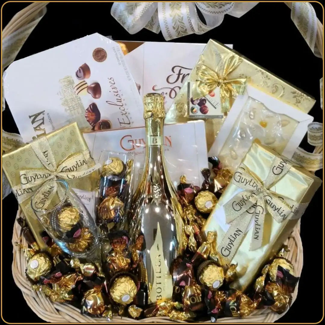 Poklon korpa Bottega Gold je pažljivo kreiran poklon za ženu koja voli penušavi stil života i vrhunski ukus. U elegantnoj pletenoj korpi od pruća nalazi se čuvena boca Bottega Gold, okružena belgijskim i italijanskim čokoladama i finim detaljima. Savršen poklon za rođendan, godišnjicu ili trenutke kada želite da ostavite snažan utisak. 🎀 Ova korpa je deo kolekcije poklon korpi za žene, a idealna je i kao poklon za suprugu ili devojku.
