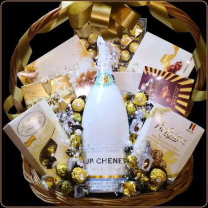 Ova elegantna poklon korpa sadrži JP Chenet Ice Edition Magnum 1,5L – posebno izdanje francuskog penušavog vina poznatog po laganom, osvežavajućem ukusu koji se služi sa ledom. Savršeno se uklapa sa izborom najfinijih evropskih čokolada, pralina i bombonjera koje stvaraju čaroban balans ukusa i estetike.