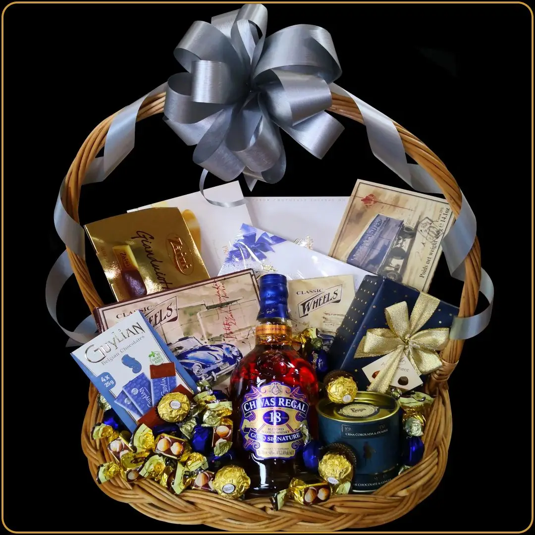 Centralno mesto u ovoj korpi zauzima viski koji nosi reputaciju i istoriju. Chivas 18 je poznat po kompleksnosti, dubini ukusa i savršenoj ravnoteži. Prate ga čokolade i praline renomiranih evropskih brendova, birane tako da upotpune celokupni doživljaj.