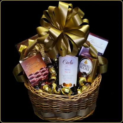 U središtu poklon korpe nalazi se Cielo Merlot – suvo italijansko vino, sa bogatim aromama crvenog voća, diskretnim začinskim notama i baršunastim završetkom. Ovo vino dolazi iz vinograda Veneta, poznatih po tradiciji koja traje više od 100 godina. Elegantno i pitko, odlično se slaže uz čokoladu i uživanje bez žurbe.