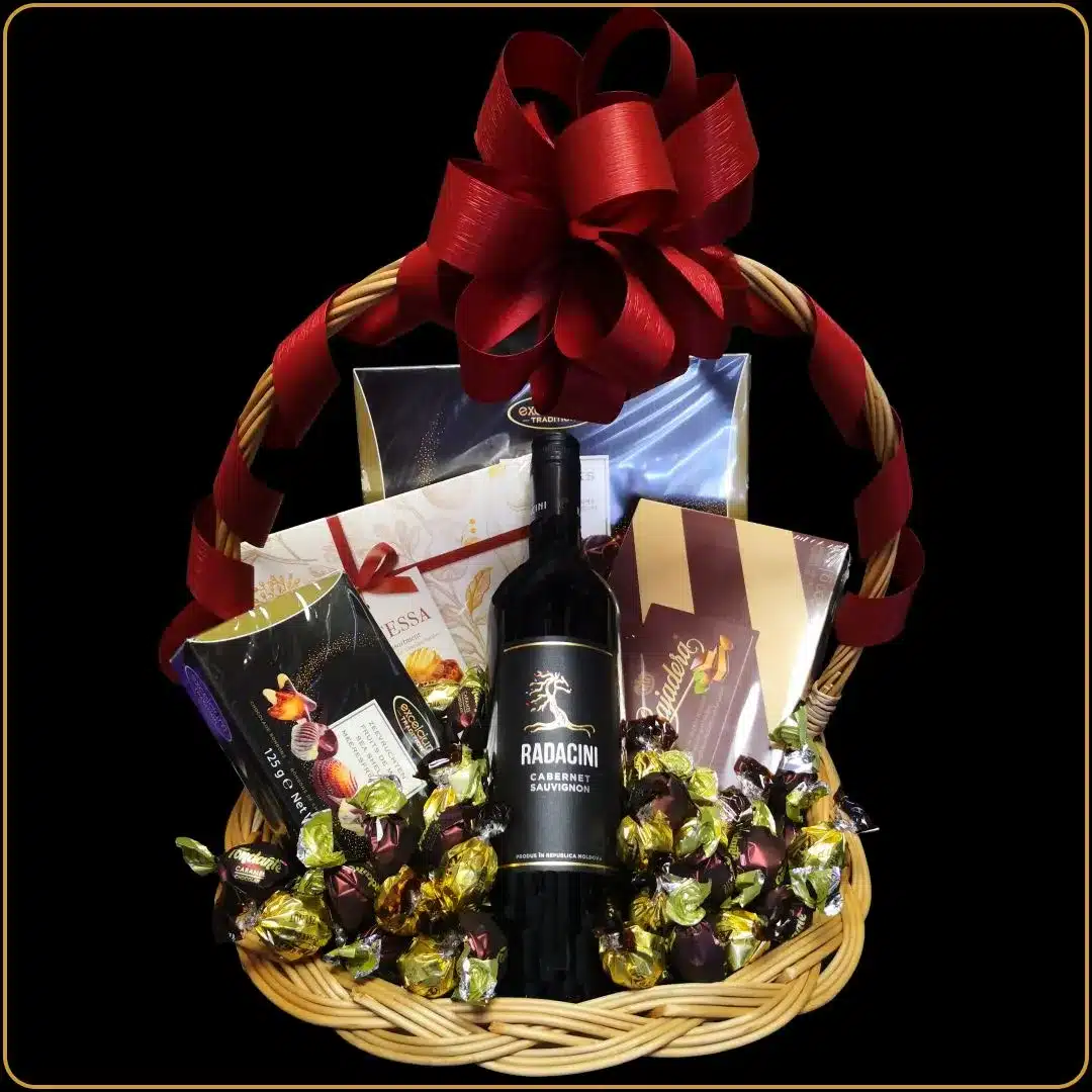 Centralno mesto u ovoj korpi zauzima izuzetni Radacini Cabernet Sauvignon (0.75l) – vino poznato po balansu, izraženim taninima i notama zrelog crnog voća. Ovo vino dolazi iz Moldavije i nosi epitet elegancije bez pretenzije. Prati ga pažljivo odabrani izbor čokolada i bombonjera: