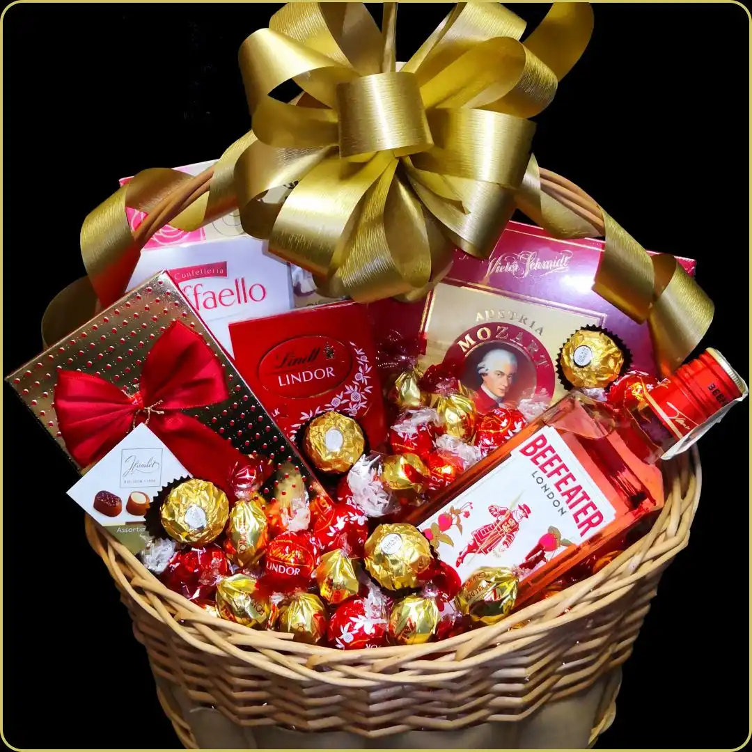 U srcu korpe je Beefeater Pink – voćni džin roze boje, savršen za dame koje vole piće sa stilom. Ovaj džin je osvežavajuć i moderan, a u kombinaciji sa luksuznim čokoladama pruža kompletan doživljaj. Pogledajte i Mozart Red korpu kao alternativu sa kremastim likerom od jagode.