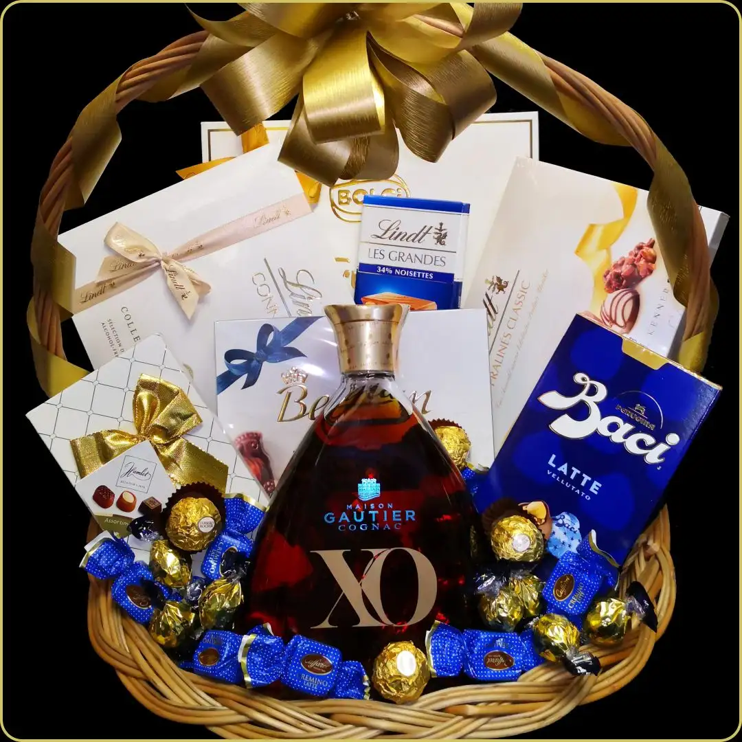 🎁 Poklon korpa Gautier XO – luksuzan poklon sa konjakom i čokoladama za posebne prilike