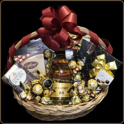 Središte ove raskošne korpe zauzima boca JP Chenet 24 Carat Gold – penušavo vino iz prestižne Gold kolekcije, poznato po svom bisernom sjaju i notama vanile, kruške i badema. Pored vina, korpa je ispunjena svetski poznatim brendovima čokolade i pralina: