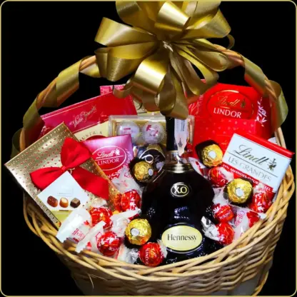 U srcu korpe nalazi se Hennessy XO, konjak koji simbolizuje prefinjenost i snagu karaktera. Odličan izbor za luksuzni poklon za žene koje cene vrhunska pića i slatkiše bez kompromisa.