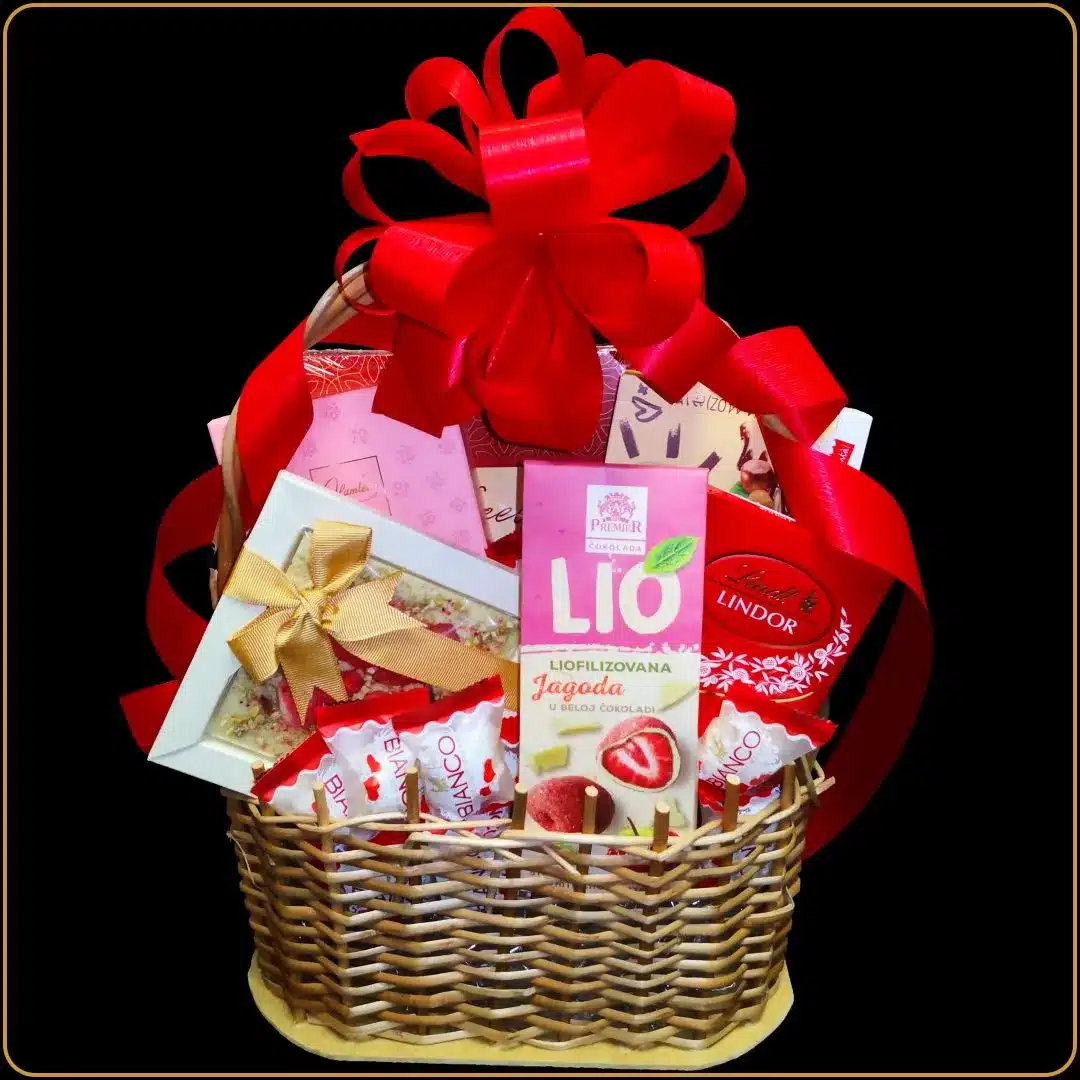 Svaka korpa dolazi sa pažljivo biranim slatkišima renomiranih evropskih brendova, upakovanih u elegantnu pletenu korpu sa celofanom i velikom crvenom mašnom, što je čini izuzetnim vizuelnim i emocionalnim iskustvom.