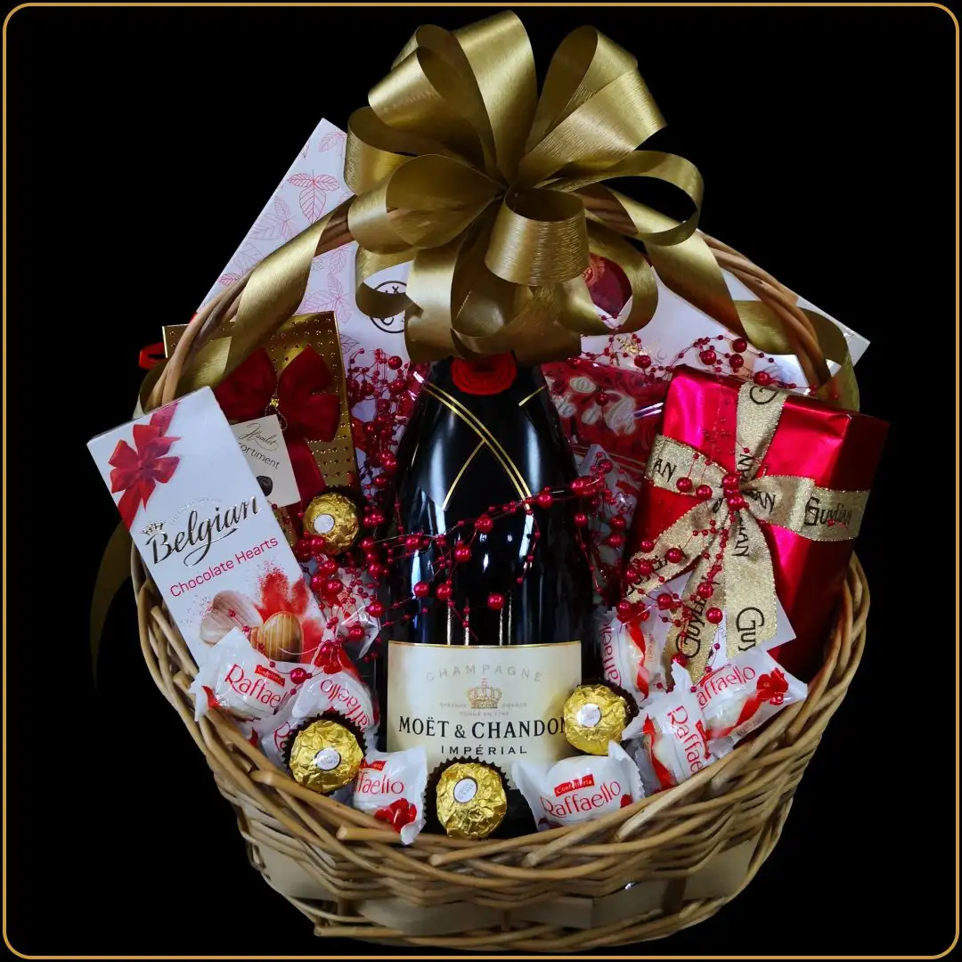 Flaša Moët Magnum u srcu ove korpe simbolizuje prestiž, slavljeničku atmosferu i dobar ukus. Idealna za poklon za jubilej, godišnjicu, ili uspešan završetak velikog poslovnog projekta.