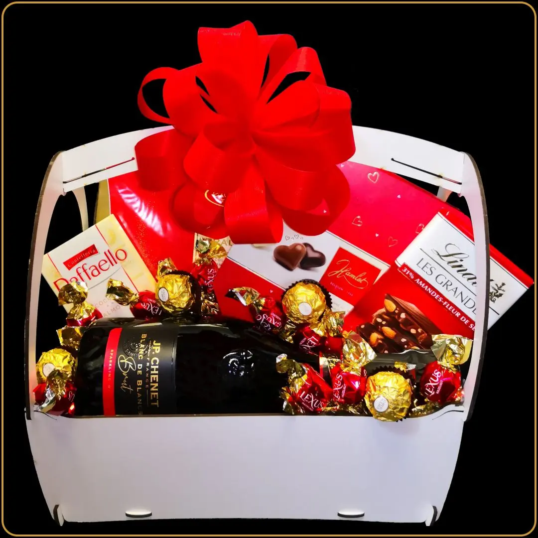 U središtu poklon korpe nalazi se elegantno JP Chenet Blanc de Blanc 0,75 l – nežno i osvežavajuće belo vino sa finim voćnim notama i suptilnom aromatikom koja podseća na lagane, romantične trenutke. Savršeno se uklapa uz čokoladne specijalitete i čini ovu korpu idealnim izborom za poklon za zaljubljene ili kao pažljivo biran poklon za ženu koja ceni eleganciju i ukus. Ako volite ovakav stil darivanja, pogledajte i poklon korpe za žene.