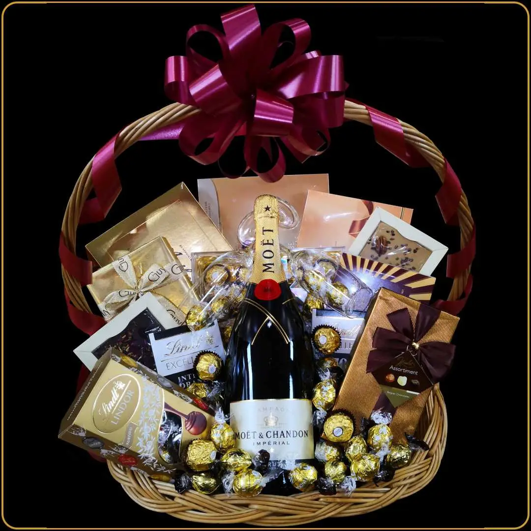 Poklon korpa Moet Magnum osmišljena je za dame koje zaslužuju samo najbolje. U elegantnoj pletenoj korpi smestila se flaša Moet & Chandon Magnum šampanjca – simbol luksuza i proslave, okružena vrhunskim čokoladama i dekoracijom. Dva kristalna pehara za šampanjac doprinose utisku ekskluzivnosti, dok pažljivo odabrani slatkiši upotpunjuju priču o ukusu i pažnji. Idealna je kao poklon za godišnjicu za žene, jubilarni rođendan ili kao iznenađenje za posebnu priliku koja traži više od reči.