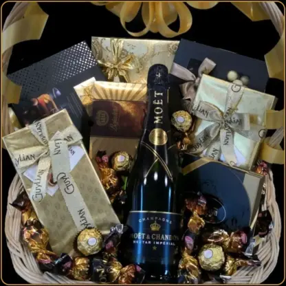 Poklon korpa Moet Nectar namenjena je ženama koje ne biraju uvek sigurno, već biraju drugačije. One koje vole da istražuju, da probaju novo, da pomere granice ukusa i doživljaja. U ovoj raskošnoj poklon korpi, u elegantnom zlatno‑crnom aranžmanu, nalazi se francuski šampanjac Moet & Chandon Nectar Imperial, okružen pažljivo odabranim čokoladama i bombonjerama vrhunskog kvaliteta.