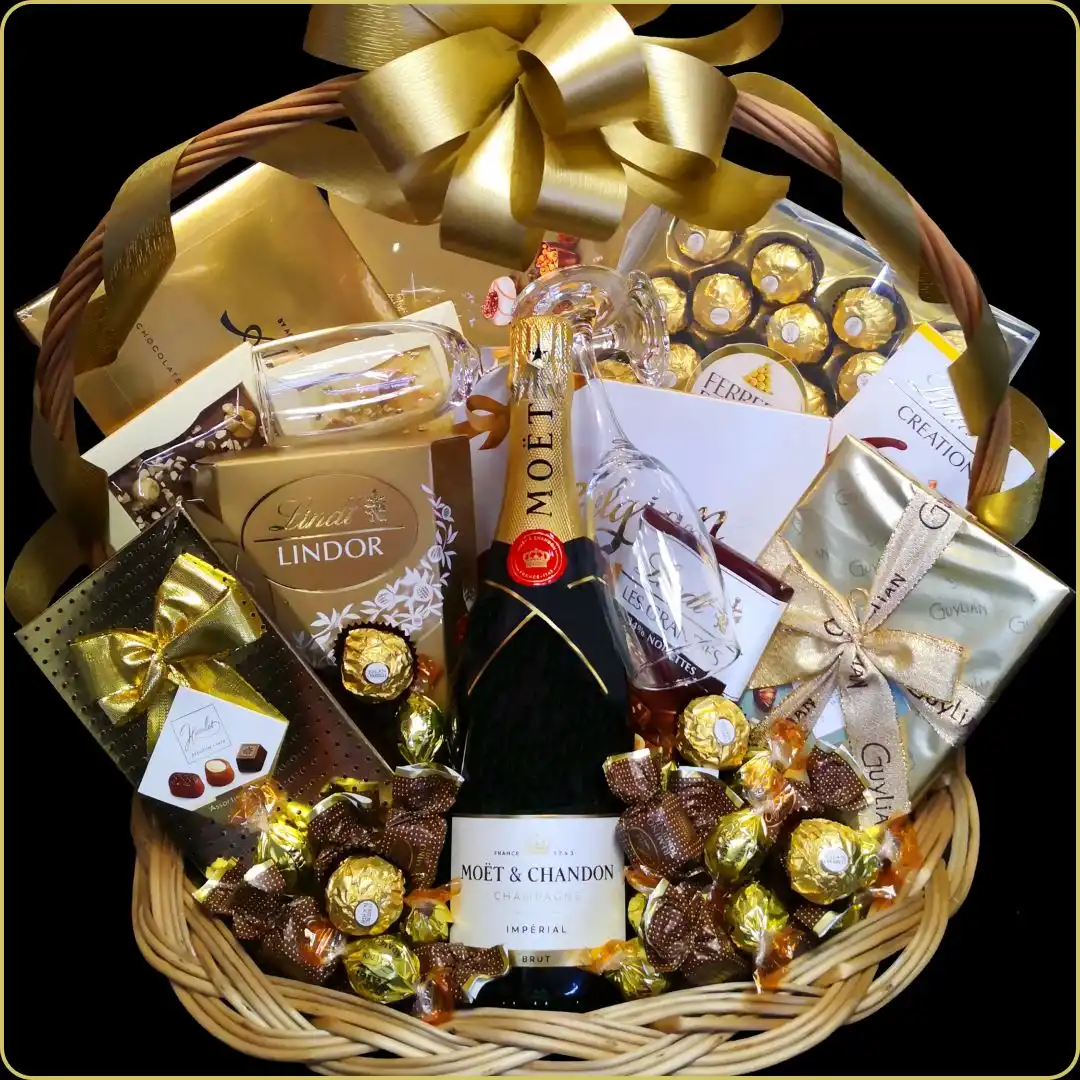 U srcu ove luksuzne poklon korpe nalazi se Moet & Chandon Brut Imperial, šampanjac koji već vekovima simbolizuje prestiž i eleganciju. U kombinaciji sa premium čokoladama, stvara savršen dar za dame i muškarce koji znaju da uživaju u životu.