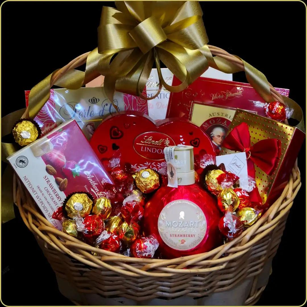 Poklon korpa sadrži čak deset pažljivo odabranih čokoladnih delikatesa poznatih svetskih brendova. Od Lindt Creation Petits Deserts i Belgian Seashells do romantičnih pralina Anthon Berg jagoda-šampanjac, svaki zalogaj predstavlja spoj umetnosti i ukusa. Srcolika kutija Lindt Milk i Mozart bombonjera dodatno naglašavaju romantiku i eleganciju ovog poklona.