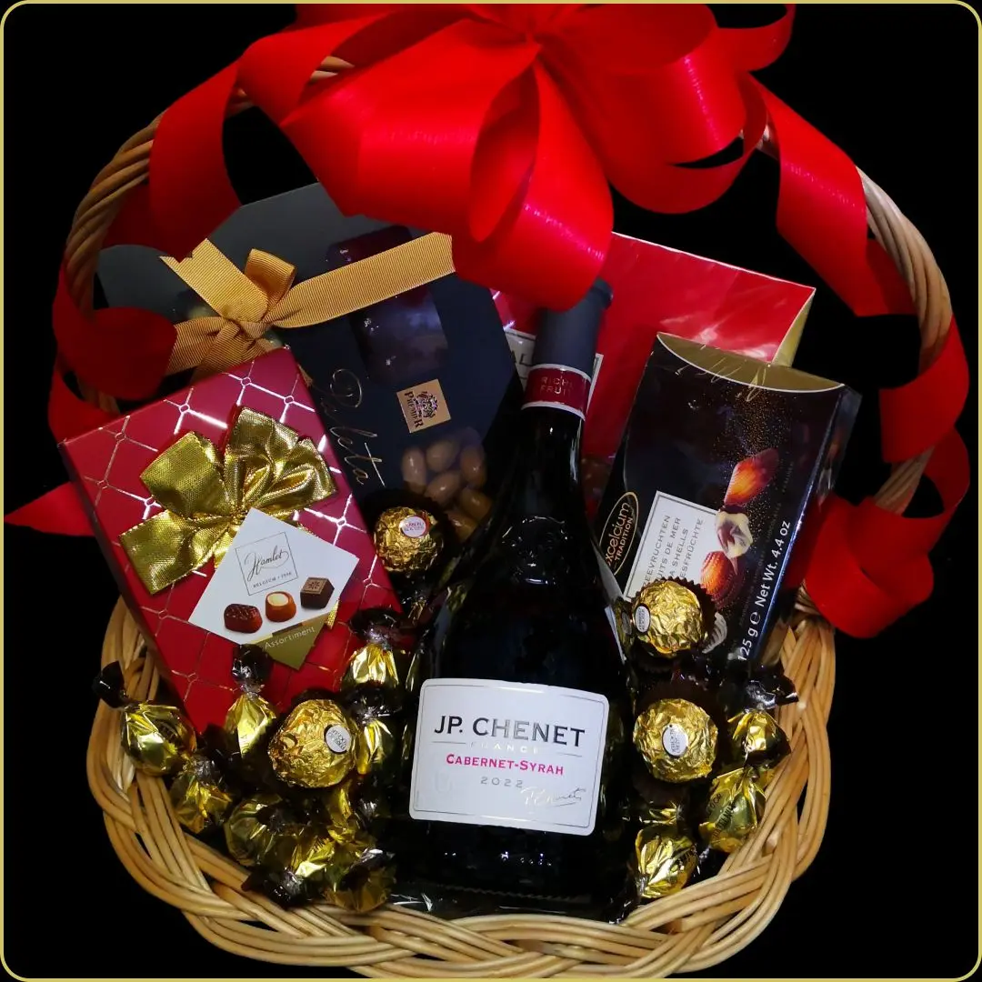 Glavna zvezda korpe je JP Chenet Cabernet, vino koje odiše notama crvenog voća i savršeno se kombinuje sa čokoladama. Idealan izbor za ljubavne poklone, romantične večeri ili poslovne proslave.