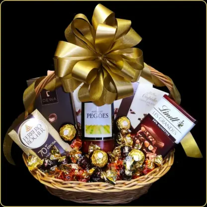Centralno mesto u ovoj poklon korpi zauzima Adega de Pegoes Tinto – autentično portugalsko crveno vino sa dubokim aromama i bogatim karakterom. Uparen sa izborom vrhunskih čokolada, svaka stavka u korpi pažljivo je birana da dopuni ovu vinsku eleganciju: