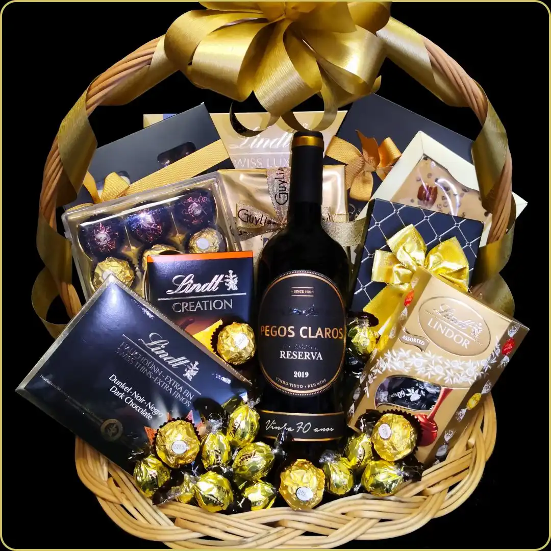 Poklon korpa Pegos Claros je raskošno aranžiran poklon za prave hedoniste – spoj vrhunskog portugalskog vina i pažljivo biranih belgijskih i švajcarskih čokolada. Idealan poklon za muškarca, proslavu godišnjice ili rođendan. Ručno izrađena, ova luksuzna poklon korpa prenosi poruku poštovanja, stila i dobrog ukusa.