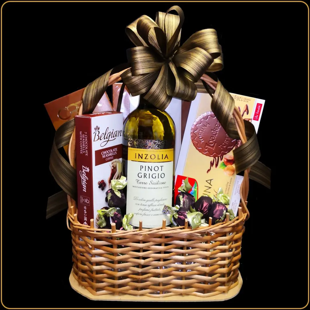 Poklon korpa Pinot Grigio je divan izbor kada želite da darujete mali, ali pažljivo sastavljen poklon sa vinom. U ukrasnoj pletenoj korpi uredno su kombinovani kvalitetno belo vino i odabrani slatkiši, što je čini idealnim poklonom za prijatelja ili kolegu. Ovo je originalan poklon za rođendan koji spaja osvežavajuću aromu belog vina sa prijatnim ukusima čokolade, stvarajući jedinstvenu harmoniju ukusa i emocija.